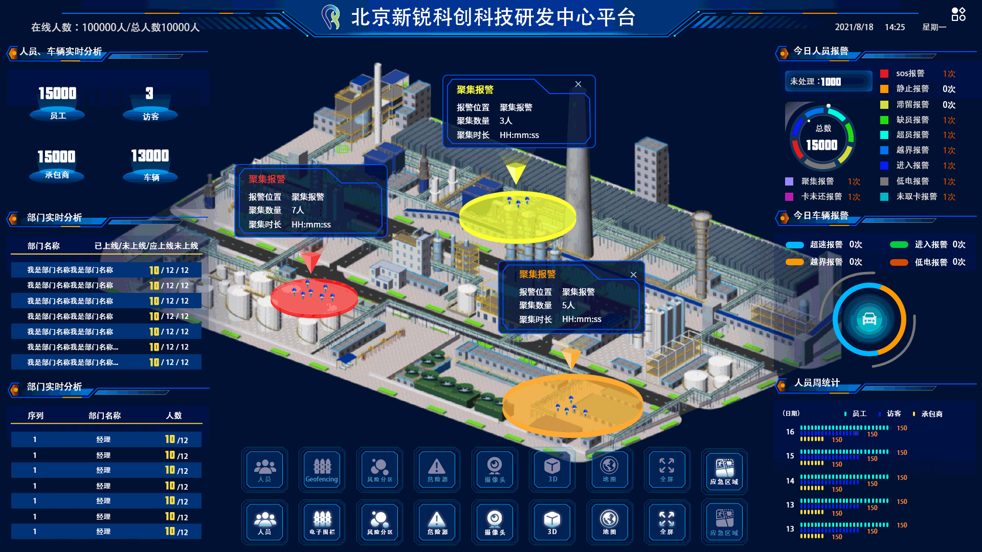 危化企業(yè)生產(chǎn)區(qū)域由于裝置設(shè)施開(kāi)停工、設(shè)備檢維修或其它原因,會(huì)導(dǎo)致在局部作業(yè)區(qū)域出現(xiàn)作業(yè)操作人員、指揮管理人員不定時(shí)、不定點(diǎn)的聚集情況,一旦發(fā)生泄漏中毒、火災(zāi)爆炸、高溫高熱物質(zhì)噴濺等事故,人員聚集將會(huì)在一定程度上加重事故后果的嚴(yán)重程度,因此,通過(guò)技術(shù)手段實(shí)時(shí)監(jiān)測(cè)人員分布情況,預(yù)防人員聚集風(fēng)險(xiǎn),對(duì)化工企業(yè)而言意義重大。
