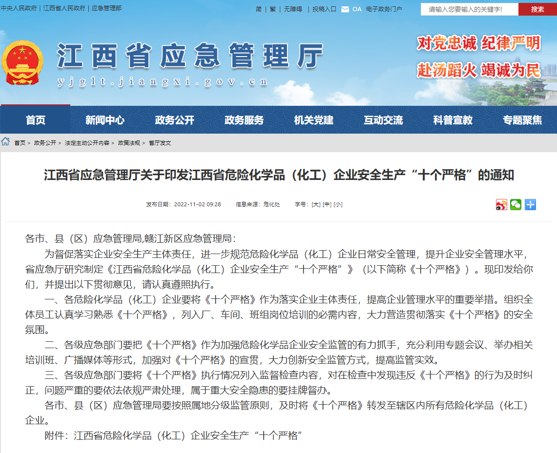 2022年11月2日,江西省應急管理廳發布關于印發江西省危險化學品(化工)企業安全生產“十個嚴格”的通知。通知明確提出,各危險化學品(化工)企業要將《十個嚴格》作為落實企業主體責任,提高企業管理水平的重要舉措。