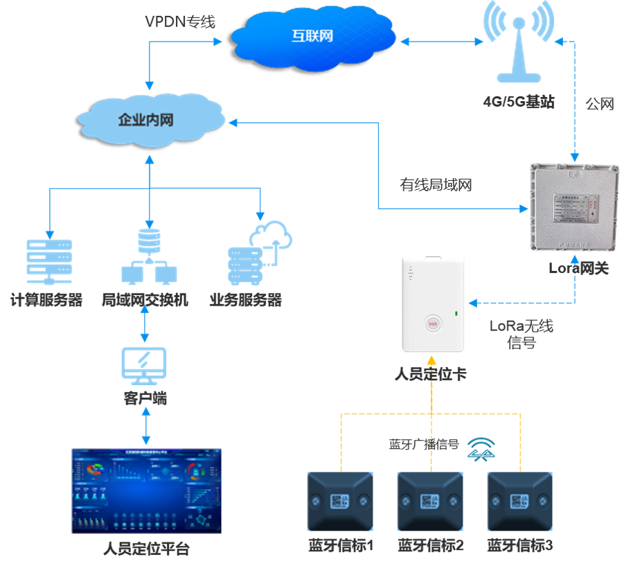 3、LoRa網(wǎng)關(guān)收集藍(lán)牙定位卡信息及藍(lán)牙信標(biāo)廣播信息,并通過(guò)4G/5G網(wǎng)絡(luò)或網(wǎng)線(xiàn)將信息傳輸?shù)椒?wù)器;