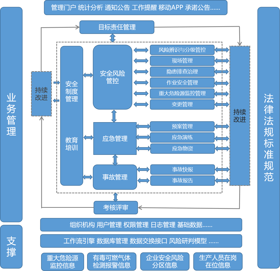 主要包括企業年度安全生產目標的制定與發布、安全目標分解與考核、安全管理網絡劃分、安全例會、安全生產責任制、安全投入、安全文化建設等功能。