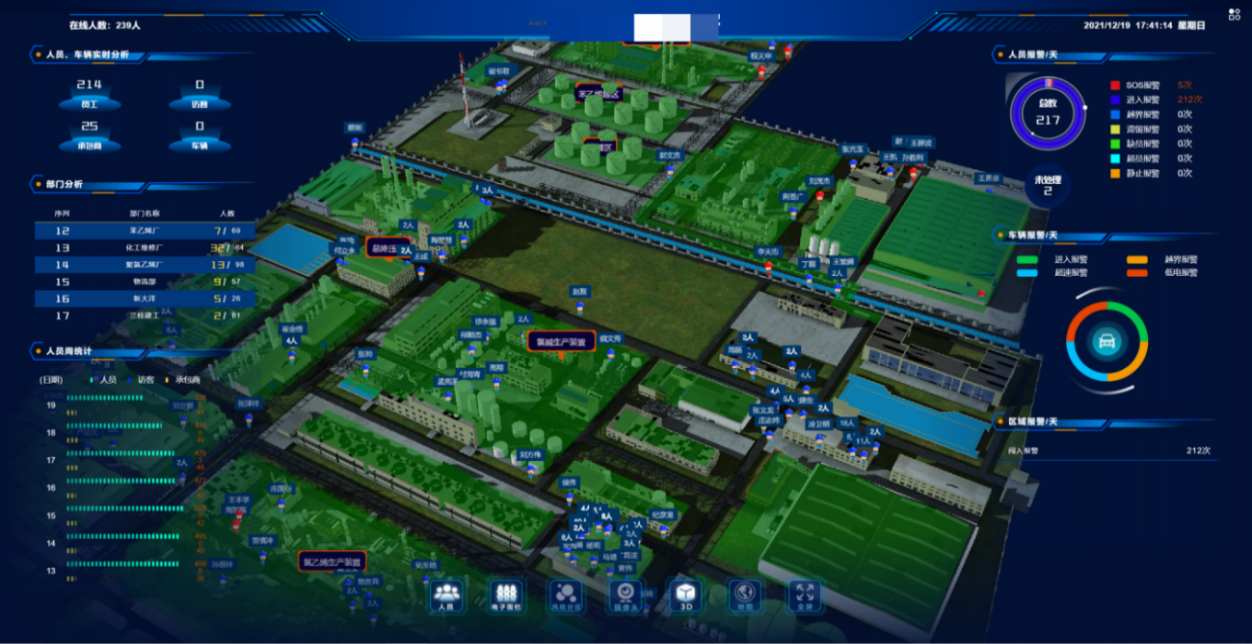 系統界面支持3D地圖,支持縮放、分層等查看方式;分場景、分樓層、以不同形式或顏色展示工作人員和外來訪客人員。戶外區域精度達到1-3米延時不超過5秒,點擊員工圖標可展示其相關信息。