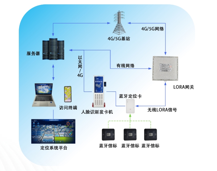藍牙+LoRa+5G室內外融合定位系統的原理主要基于無線信號傳輸和定位算法。具體來說,系統由藍牙信標、定位標簽、定位基站、定位引擎和展示終端組成。