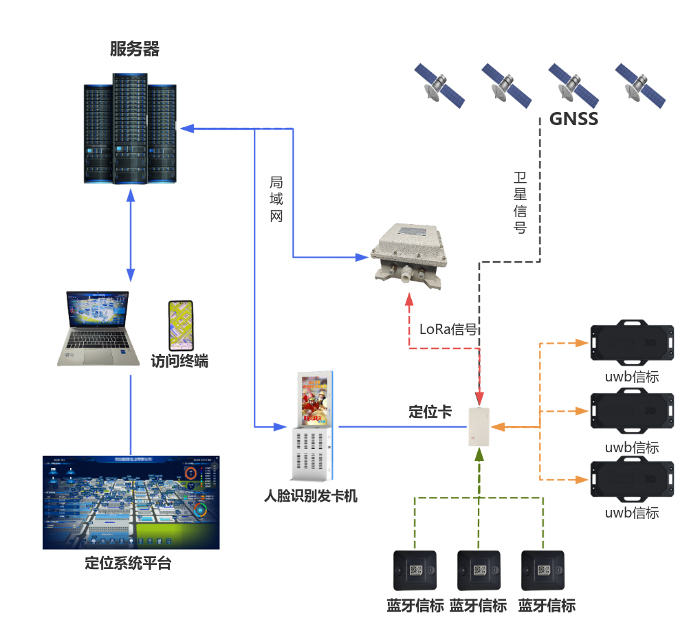 本方案基于LoRa、UWB、GPS/北斗三種技術(shù)的優(yōu)勢(shì)互補(bǔ)理念構(gòu)建。利用UWB技術(shù)在室內(nèi)實(shí)現(xiàn)高精度定位,LoRa技術(shù)保障數(shù)據(jù)長(zhǎng)距離、低功耗傳輸,GPS/北斗技術(shù)滿足室外基本定位需求。通過(guò)將三者有機(jī)整合,打造出適用于室內(nèi)高精度、室外一般性定位場(chǎng)景的人員定位系統(tǒng)。該系統(tǒng)適用于室內(nèi)空間結(jié)構(gòu)復(fù)雜且人員密集,而室外區(qū)域相對(duì)簡(jiǎn)單開(kāi)闊的應(yīng)用場(chǎng)景,能夠?yàn)槠髽I(yè)提供高效、精準(zhǔn)的人員定位管理服務(wù)。