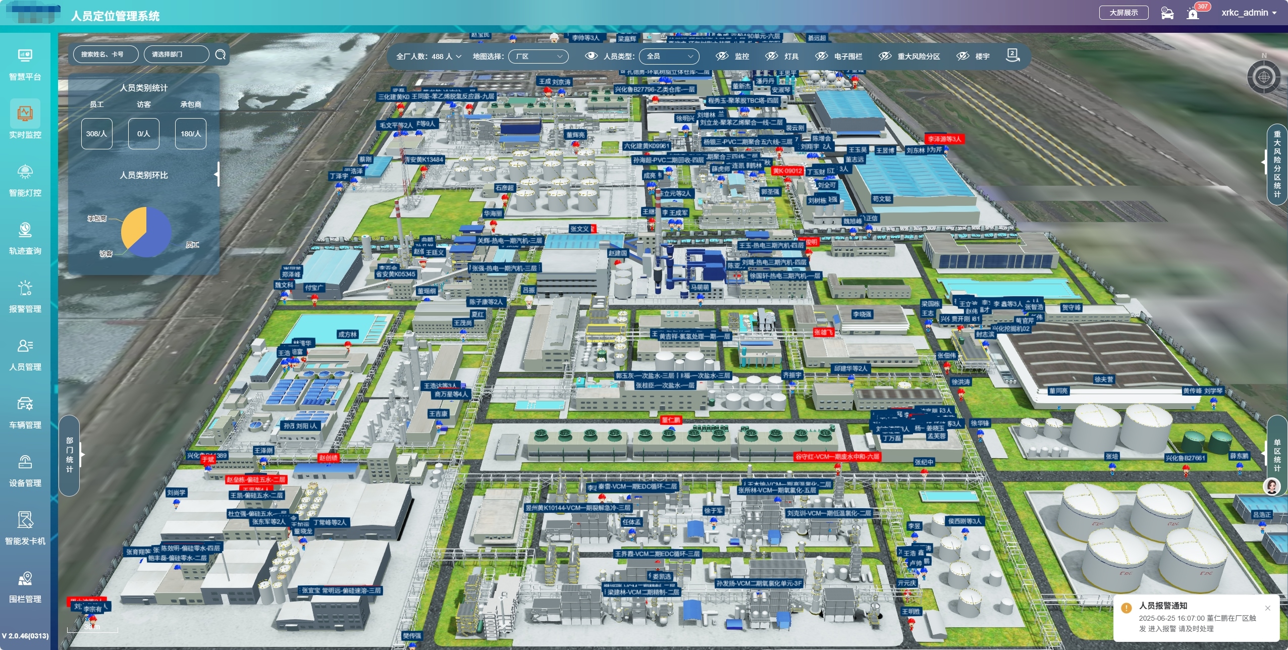化工廠的生產環境具有高危險性、復雜性等特點,各類化學反應、易燃易爆物質以及復雜的設備布局,給人員安全管理帶來極大挑戰。為了有效管控人員不規范行為,保障作業人員人身安全,部署一套高效精準的人員定位系統至關重要。
